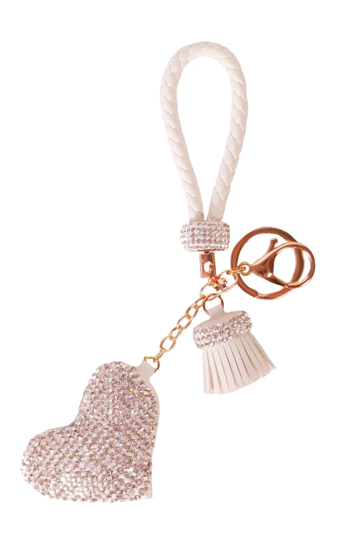 Add a touch of sparkle to your handbags with our cute Sparkly Diamond Keychain featuring heart shaped, rhinestone tassel and braided rope and a gold clip.
