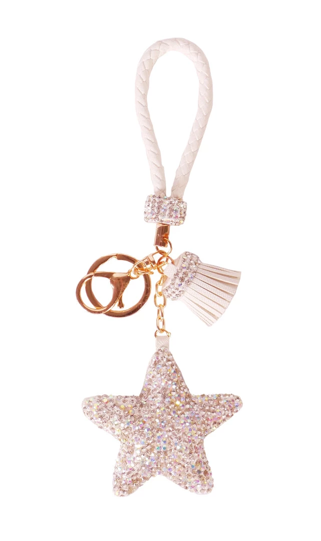Add a touch of sparkle to your handbags with our cute Sparkly Diamond Keychain featuring star shaped, rhinestone tassel and braided rope and a gold clip.