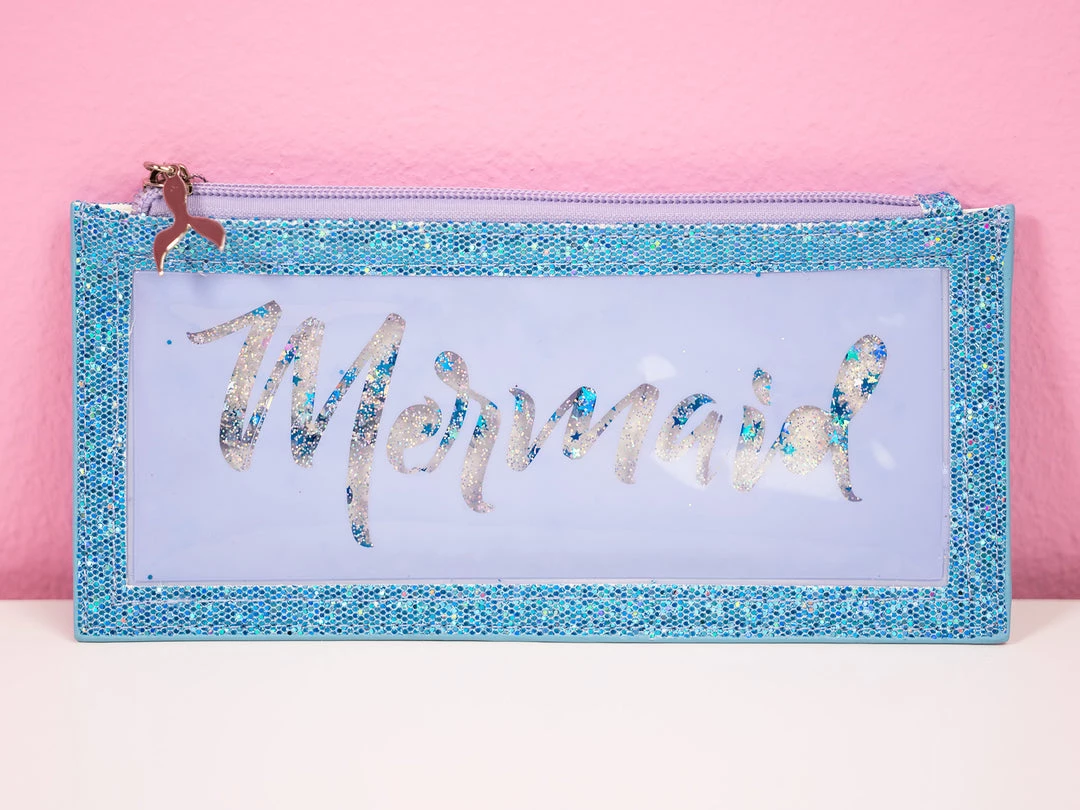 A Floating Glitter Mermaid pouch that is filled with liquid glitter and confetti. It has a zipper with a mermaid tail icon to add an extra touch of cuteness. It’s great for everyday make up tools and school supplies. Store away your brushes and eyeliner or your pens and sticky note packs!