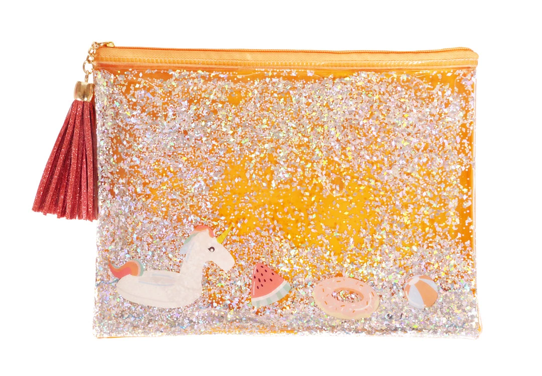 This floaty pouch has a fun tassel at the zipper and it’s made of a clear vinyl liquid glitter that you will love to hold! The unicorn floaty prints just add an extra little touch of fun! Choose your favorite pouch from this selection!Â