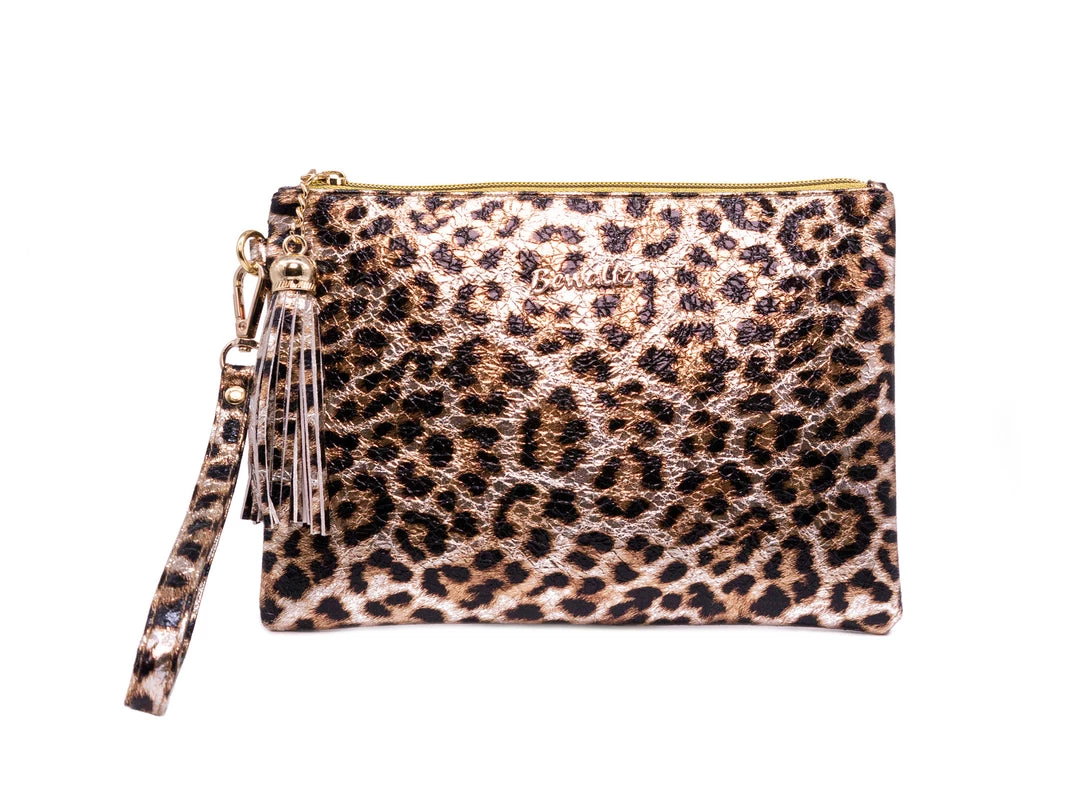 ROAR IT OUT with our shimmering metallic Leopard print clutch! No animals were harmed in the making of this lovely bag! Lightweight but still capable of carrying any and all essentials, you’ll still be able to shimmer with ferociousness for everyone! It’ll match up perfectly with your favorite black dress!Â